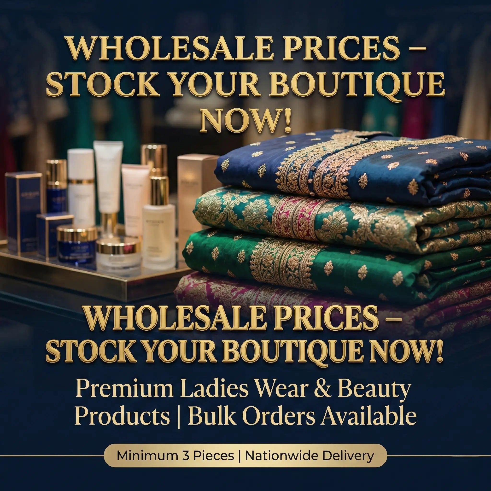 Stock your boutique or beauty business with our premium ladies wear and beauty products, now available at exclusive wholesale prices. High-quality fabrics, exquisite embroidery, and ready-to-sell products designed for resellers and boutique owners.